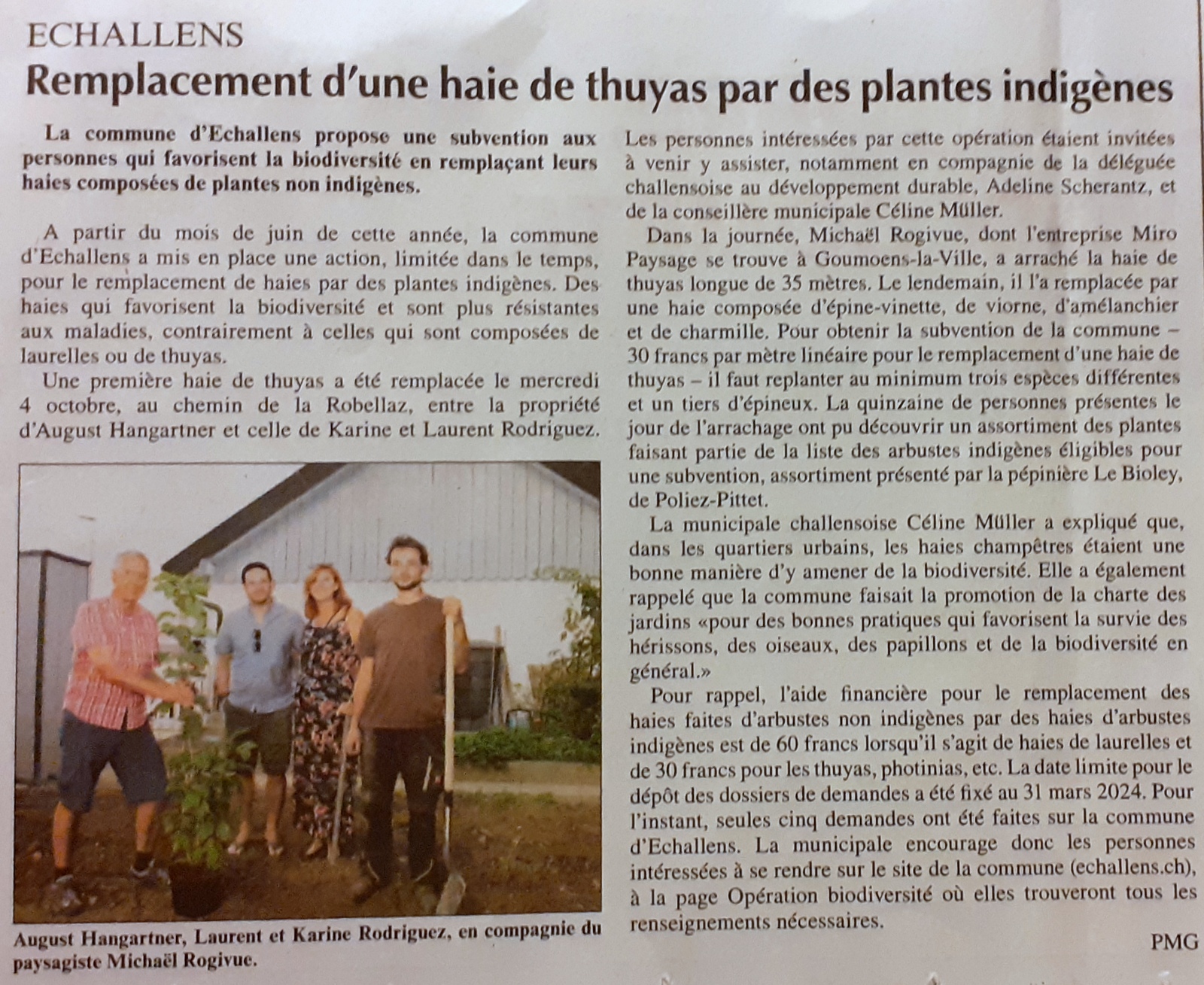 La commune propose une subvention aux personnes qui favorisent la biodiversité en remplaçant leurs haies composée de plantes non indigènes. Suite à cela, une première haie de thuyas a été remplacée au début octobre 2023. Les personnes intéressées étaient invitées à venir y assister.